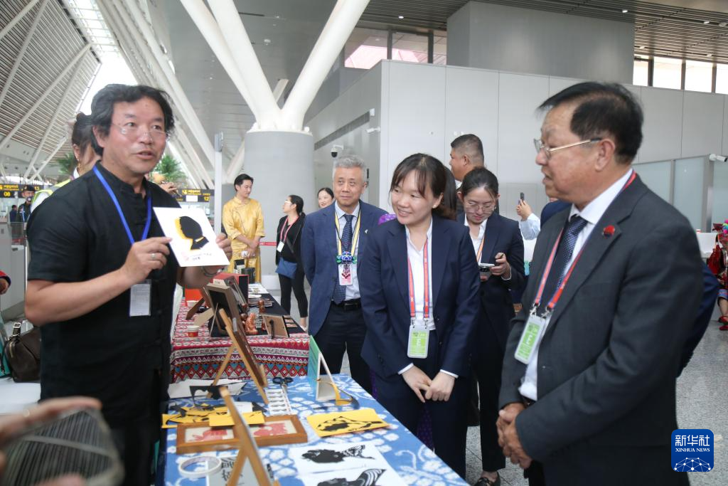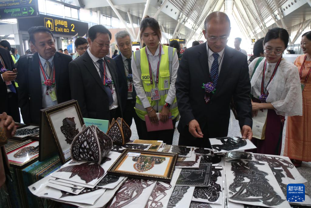 8月6日,人们在柬埔寨暹粒吴哥国际机场参观来自中国云南及柬埔寨的非遗展品。