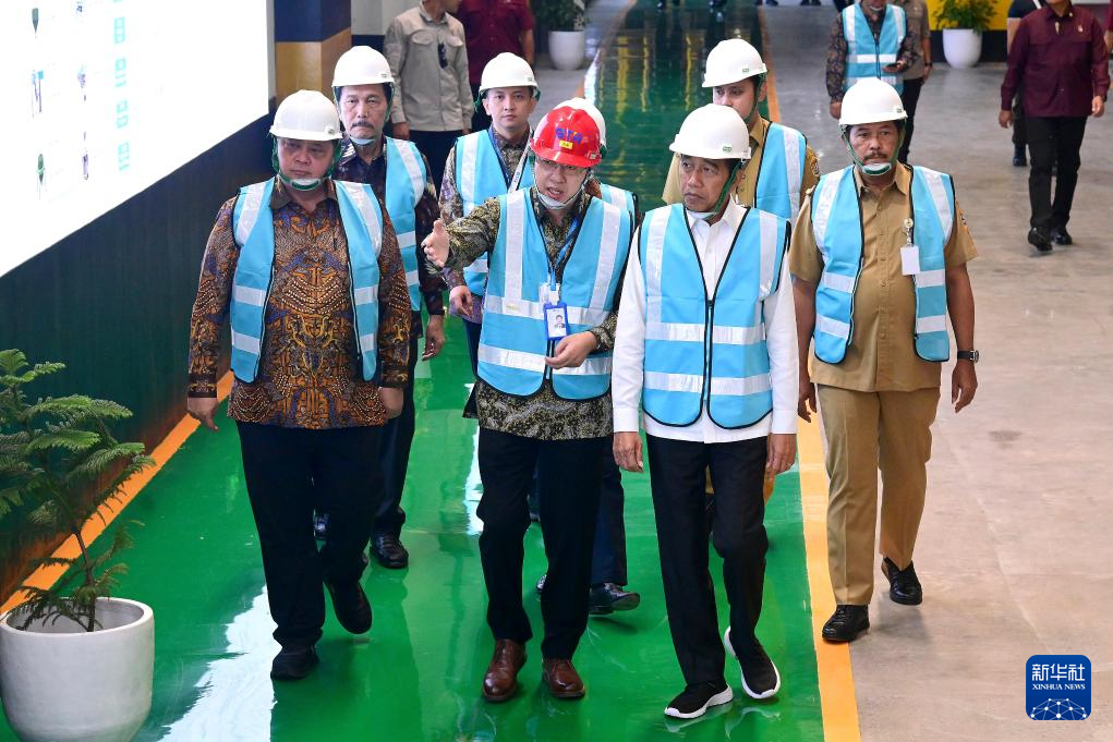 8月7日,印尼总统佐科(前右)在印度尼西亚中爪哇省视察贝特瑞新材料集团印尼工厂。