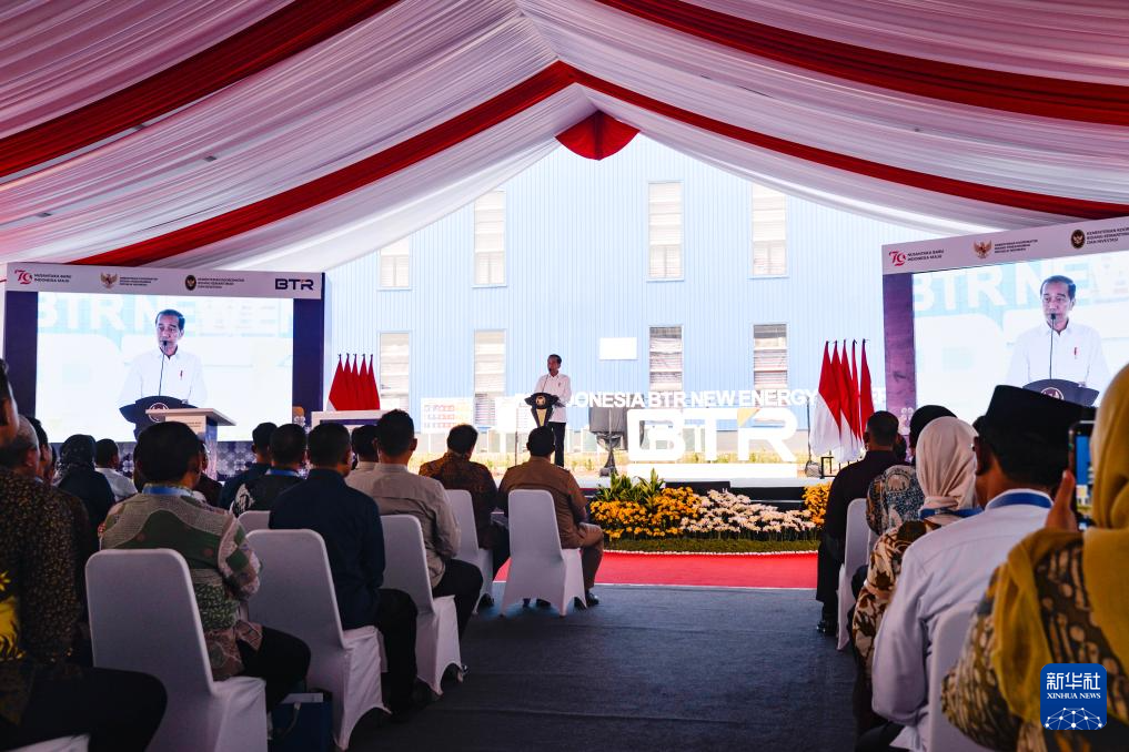 8月7日,在印度尼西亚中爪哇省,印尼总统佐科在贝特瑞新材料集团印尼工厂投产仪式上致辞。