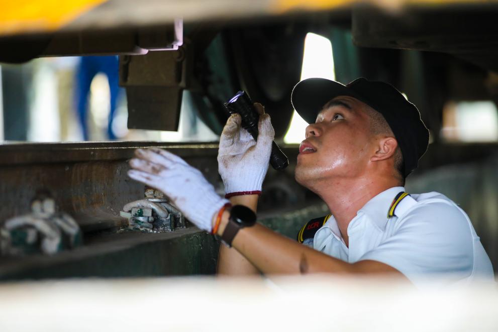 7月9日,在老挝万象,铁路工作人员检查列车部件。新华社发(杨永全摄)
