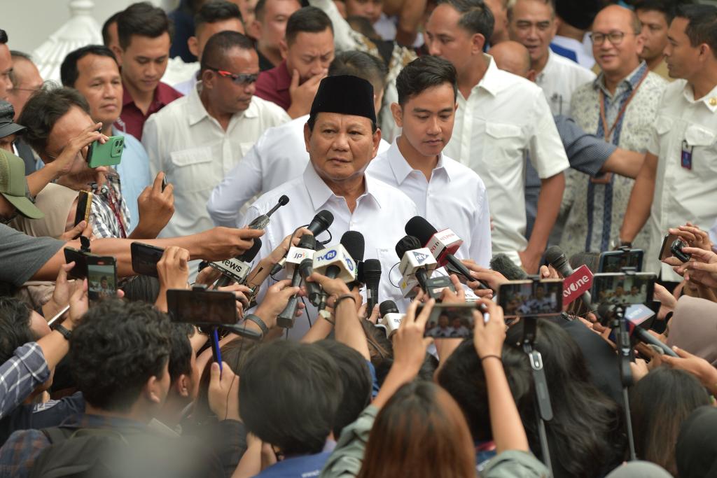 4月24日,在印度尼西亚雅加达,普拉博沃·苏比延多(中左)及其竞选搭档吉布兰·拉卡布明·拉卡(中右)接受采访。新华社发(维里摄)