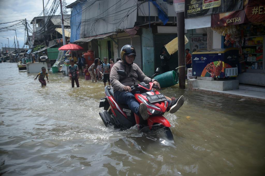 2021年11月9日,在印度尼西亚雅加达海边的居民区,居民在积水中骑行。新华社发(祖卡南摄)