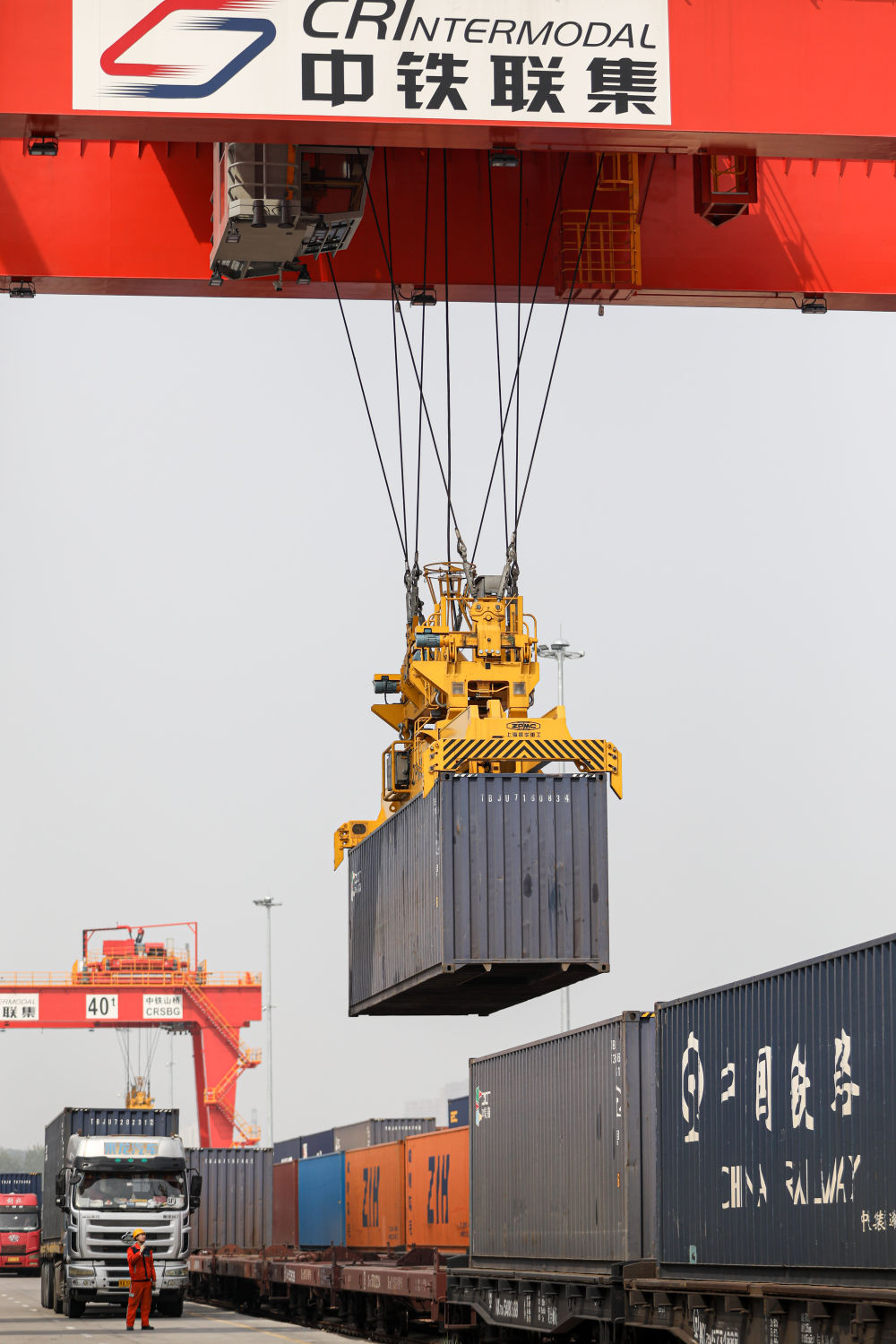 2024年4月11日,在国铁集团郑州局圃田站,中铁联集的龙门吊向货运列车上装载集装箱。当日,满载机械零配件、陶瓷玻璃制品、纱布、冰柜、洗衣机等45个集装箱的80031次货运列车从国铁集团郑州局圃田站发出,标志着首趟中老铁路(郑州—万象)国际货运列车正式按图运行。