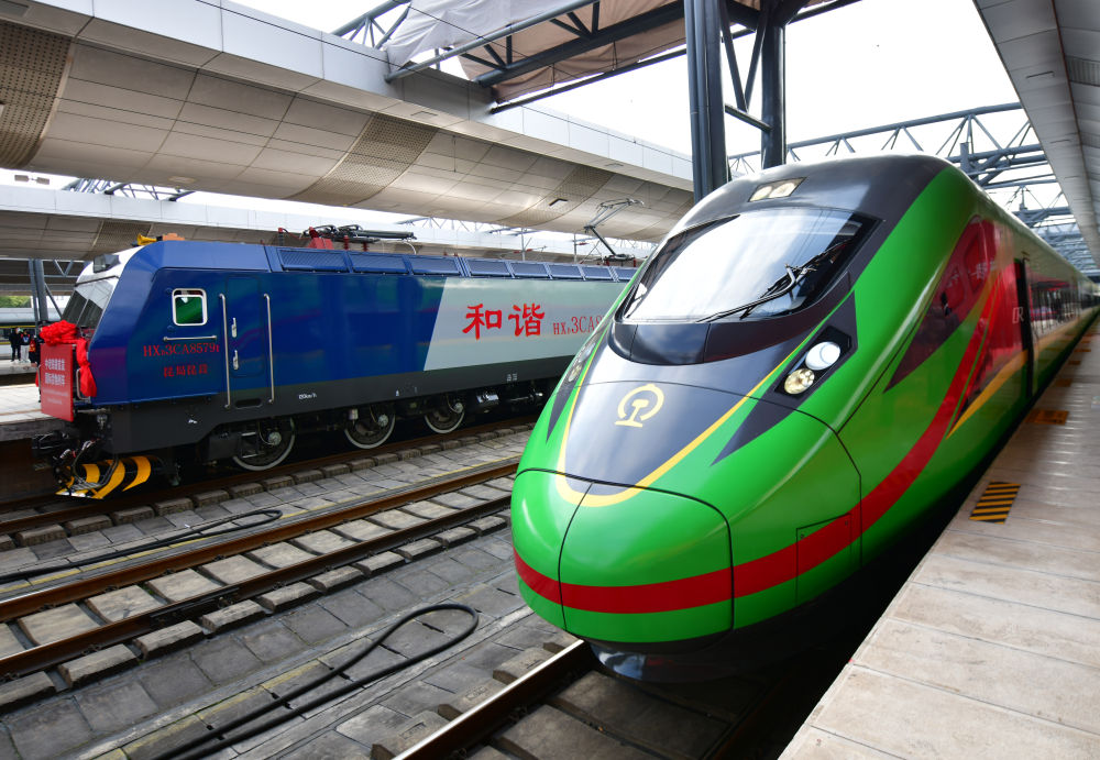 2021年12月3日,中老铁路全线开通运营。这是中国昆明站内的“绿巨人”复兴号动车组列车在等待发车。