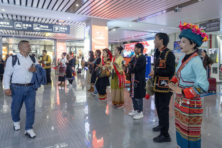 2024年12月1日,云南省普洱市文旅局组织市歌舞团工作人员在中老铁路普洱站举办庆祝中老铁路开通运营三周年迎宾活动。新华社记者 陈欣波 摄