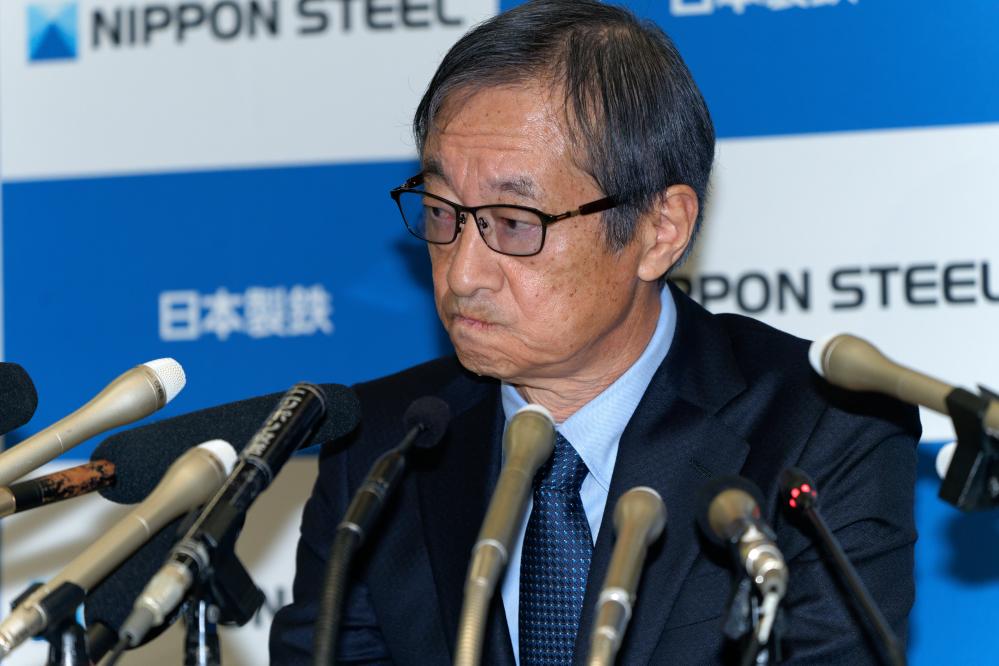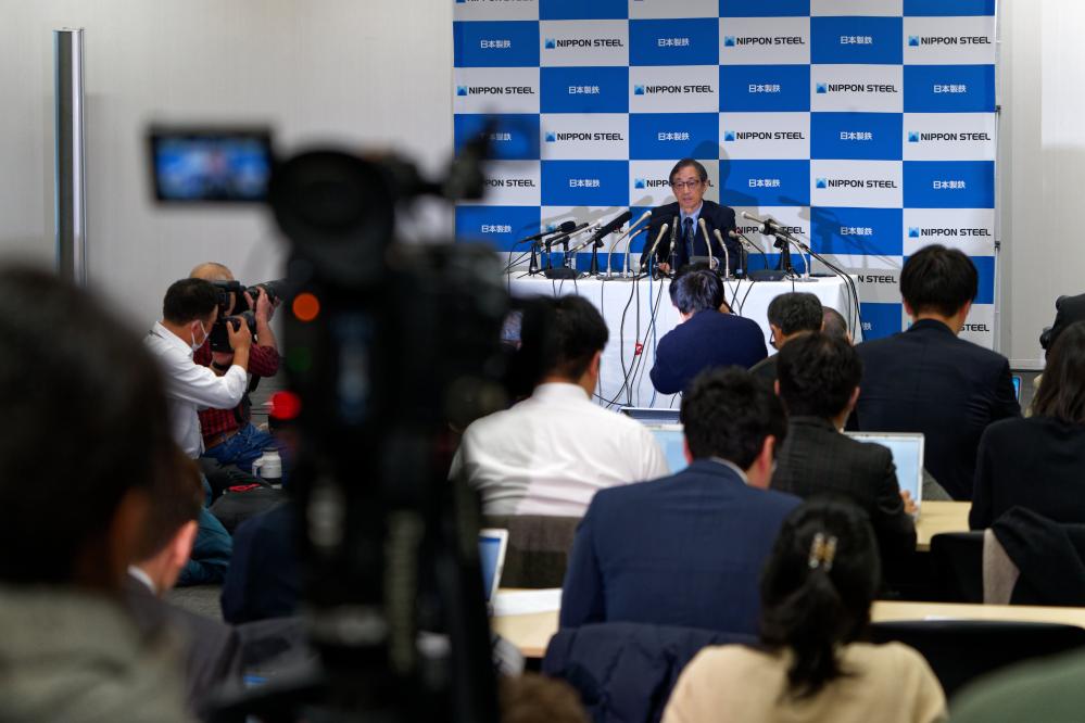 1月7日,在日本东京,日本制铁公司会长兼首席执行官桥本英二出席记者会。新华社记者张笑宇摄