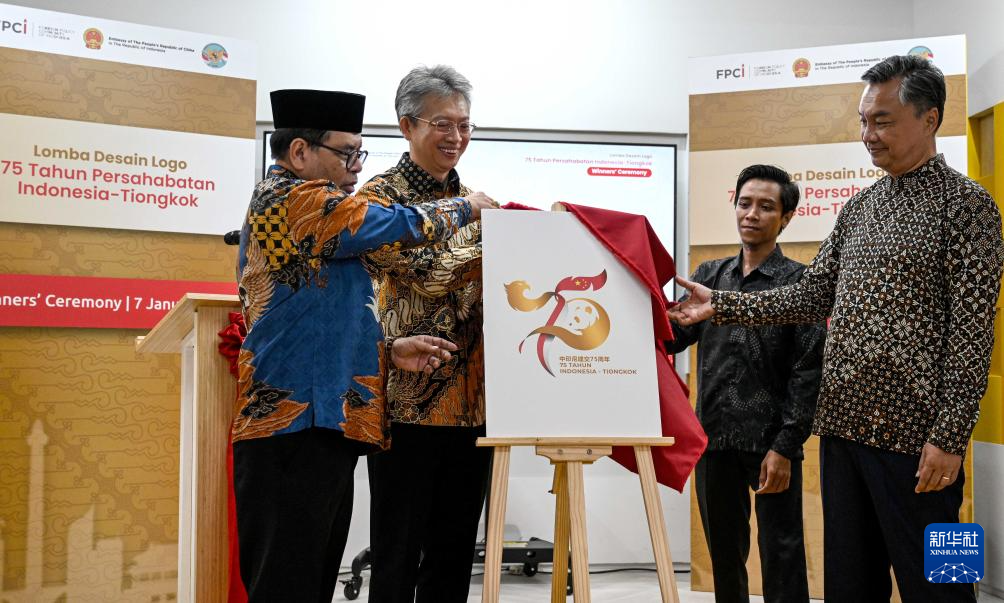 1月7日,在印度尼西亚雅加达,嘉宾为中印尼建交75周年官方纪念LOGO揭幕。新华社发(阿贡摄)