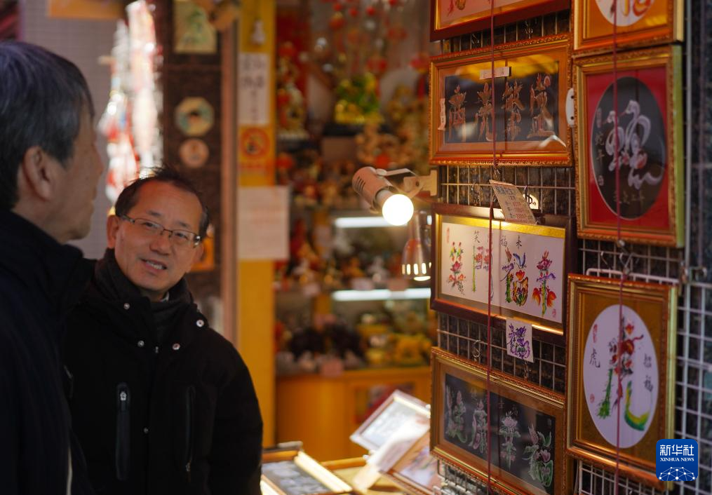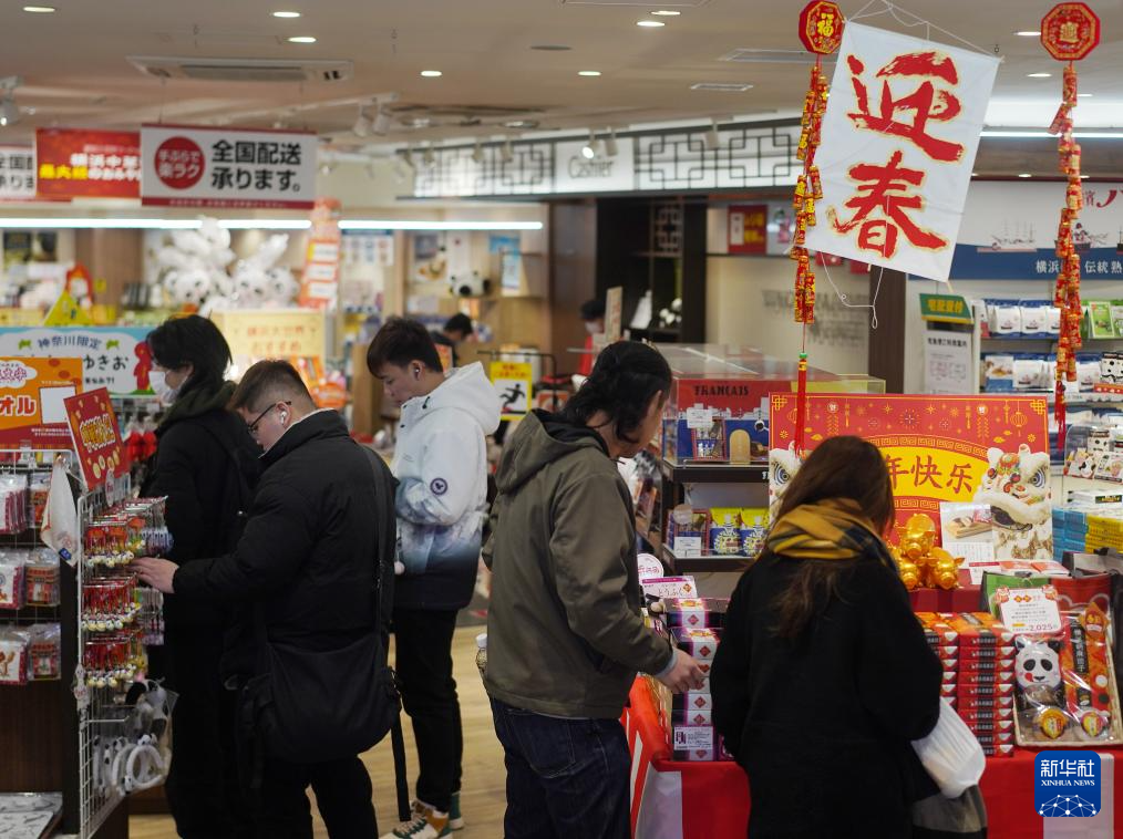 1月29日,游客在日本横滨中华街的一处商店内选购商品。
