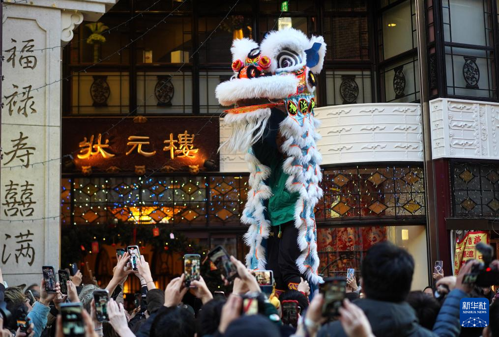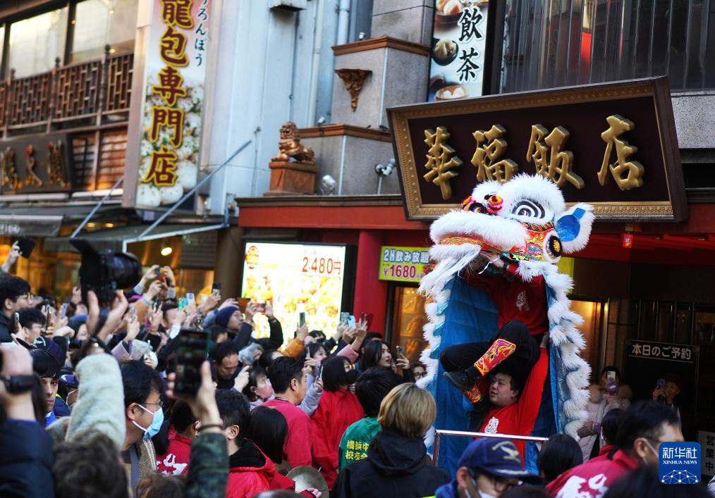 1月29日,表演者在日本横滨中华街上表演舞狮采青。