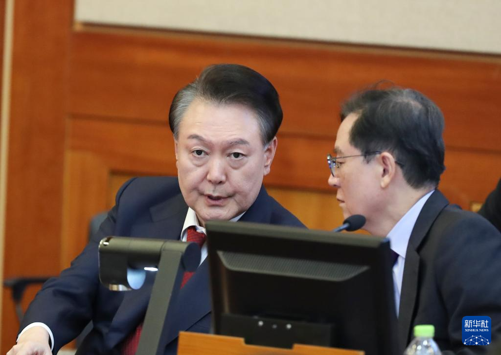 2月20日,尹锡悦(中)在韩国首尔宪法法院出席总统弹劾案庭审。