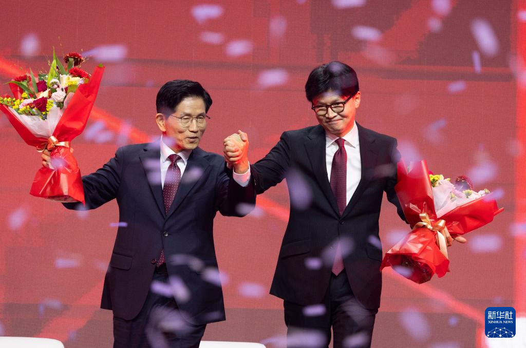 5月3日,在韩国高阳举行的韩国国民力量党大会上,国民力量党前党首韩东勋(右)祝贺金文洙竞选成功。