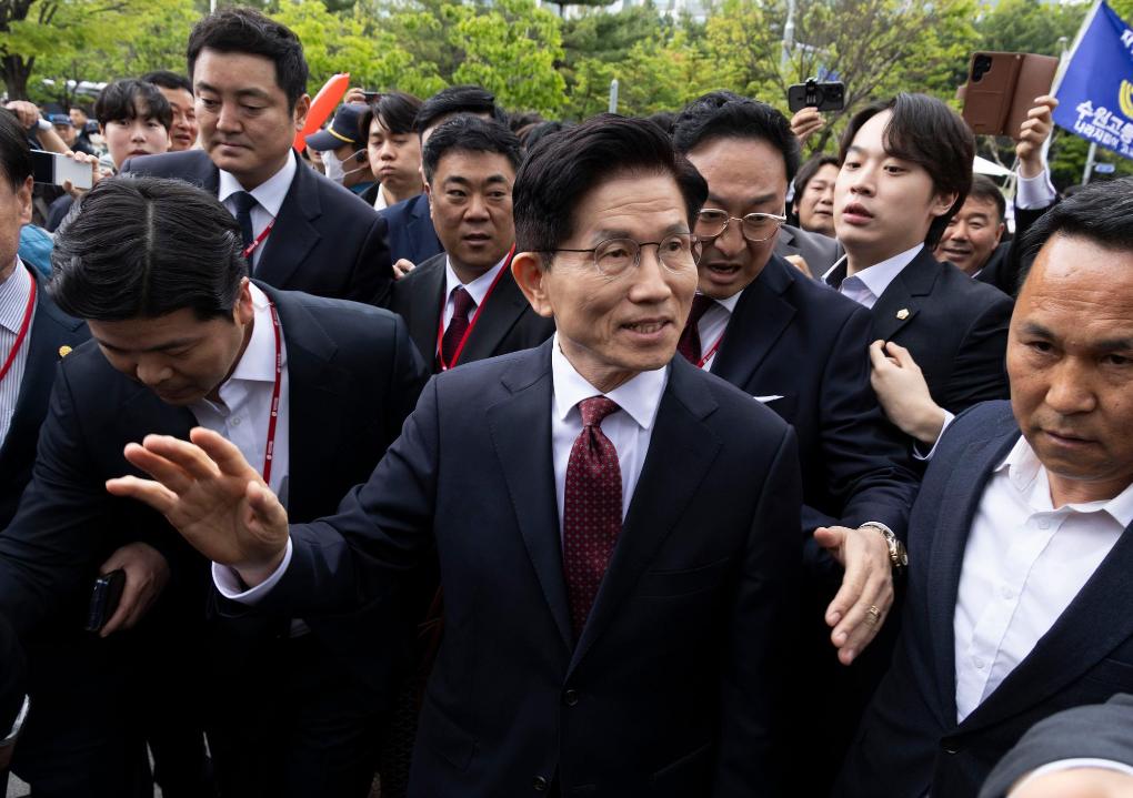 5月2日,韩国前国务总理韩德洙抵达首尔的国会出席新闻发布会。新华社记者姚琪琳摄