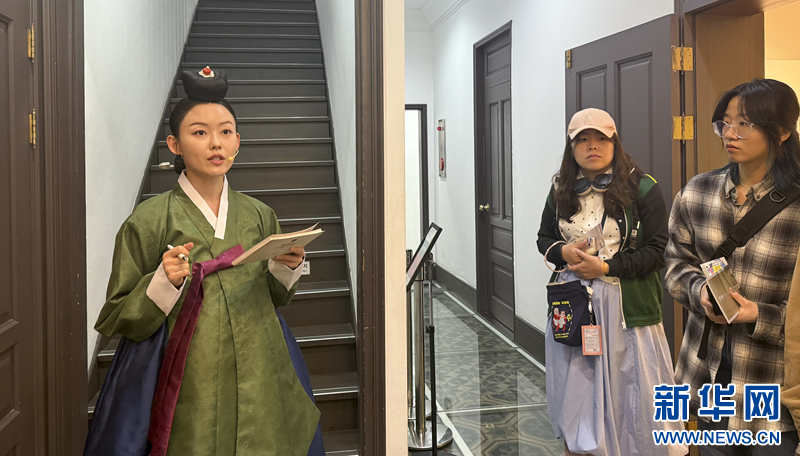 韩国工作人员向游客介绍首尔德寿宫的重明殿。记者 姚琪琳 摄