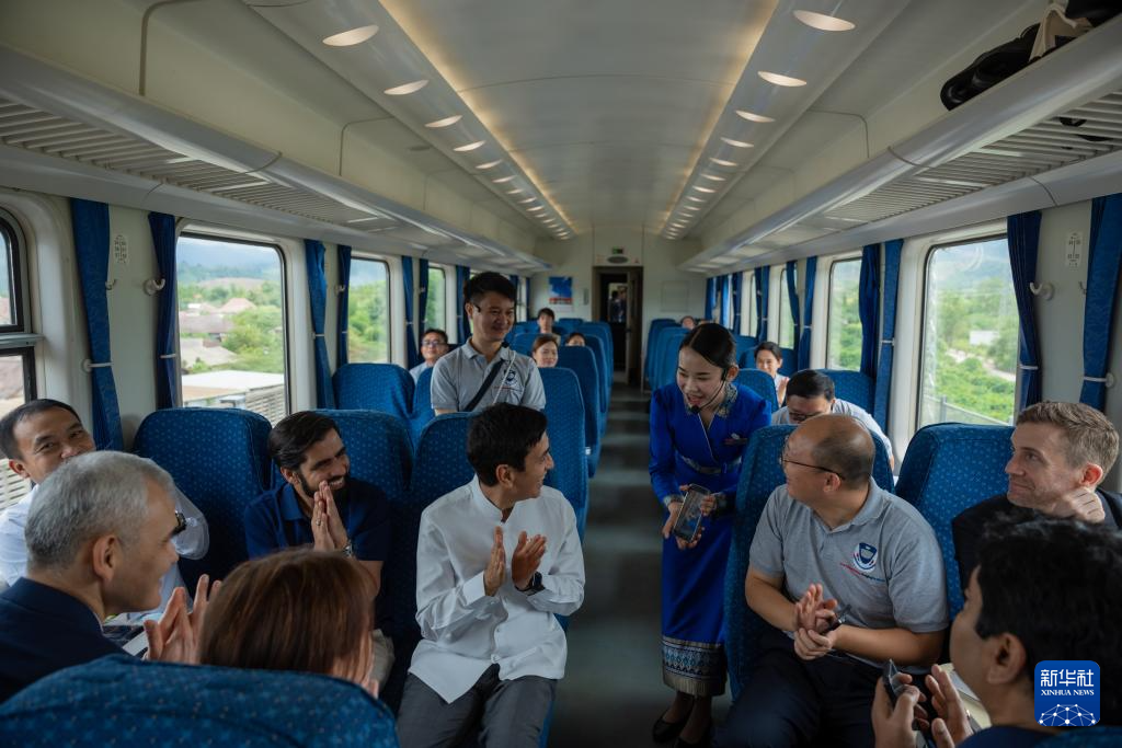 5月30日,联合国代表们在中老铁路K12次列车车厢内与乘务员交流。