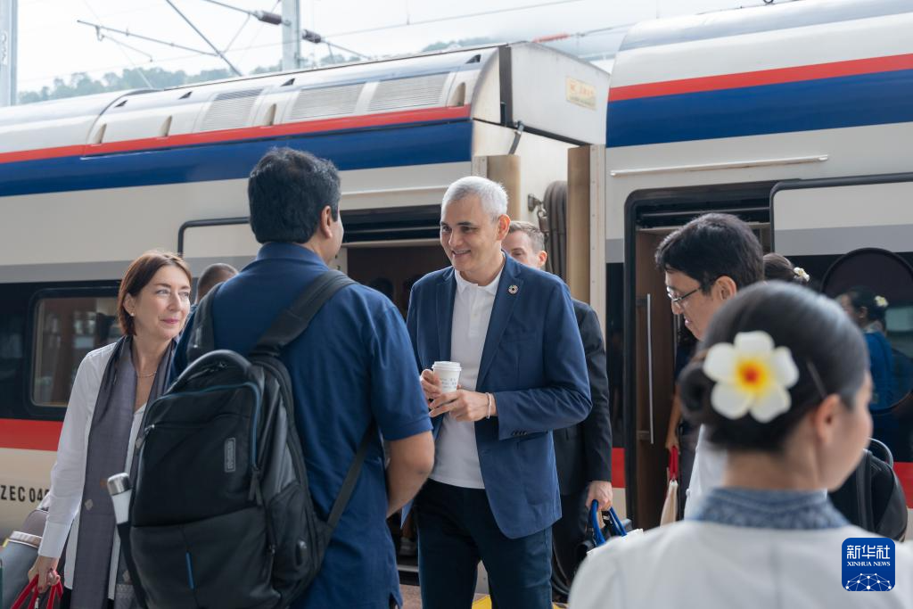 5月30日,在中老铁路老挝万荣站,联合国代表们在列车前参观交流。