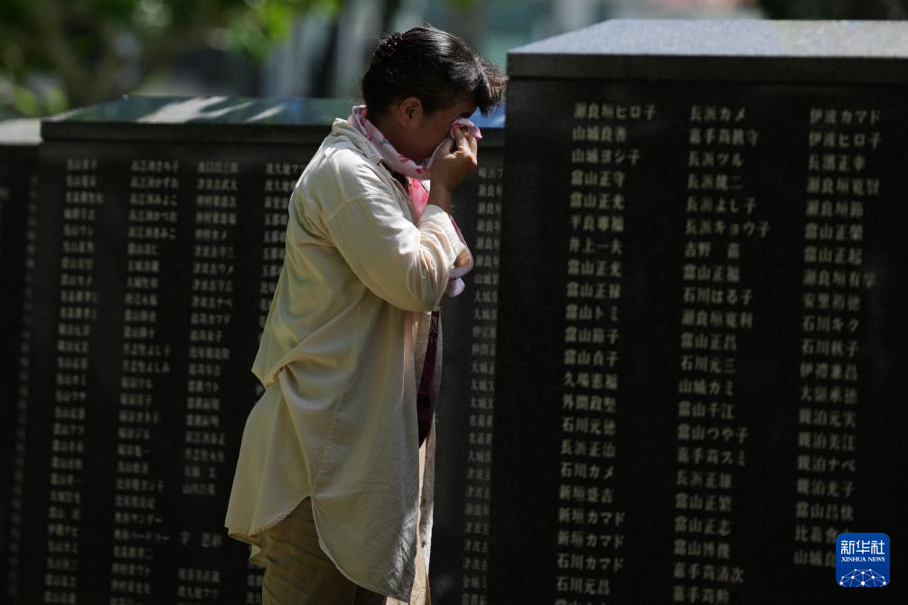6月23日,在日本冲绳,一位市民在丝满市摩文仁的和平祈念公园内祭奠亲属。新华社记者 贾浩成 摄
