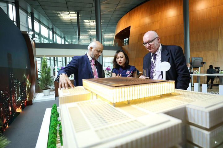 在卢森堡举行的亚投行第四届理事会年会上,与会代表在中国展区参观(2019年7月12日摄)。新华社记者 张铖 摄