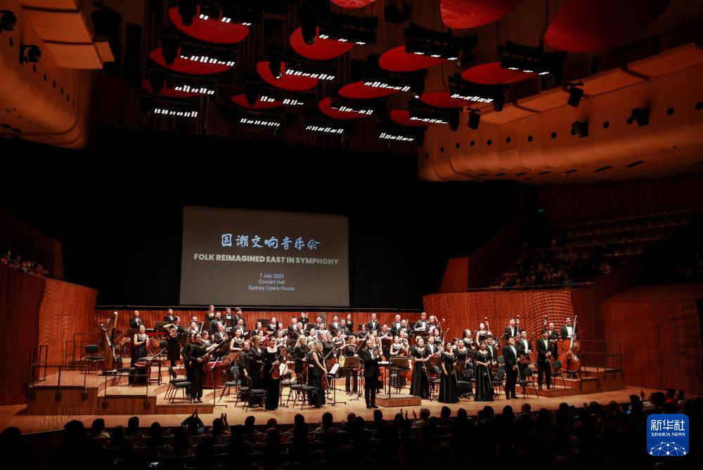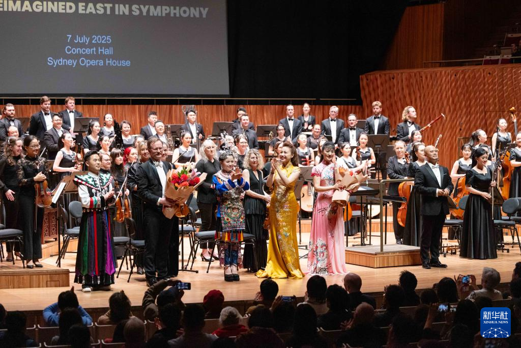 7月7日,在澳大利亚悉尼歌剧院,来自多彩贵州艺术团和澳大利亚管弦乐团的成员们在音乐会上演奏。
