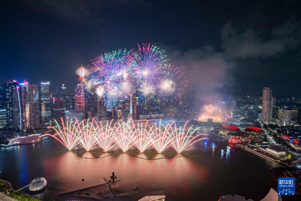 这是8月9日在新加坡滨海湾举行的60周年国庆庆典上拍摄的焰火表演。