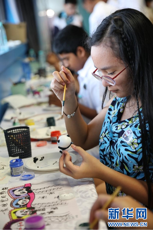 斐济学生在熊猫雕塑上进行彩绘创作。陈鹏 摄