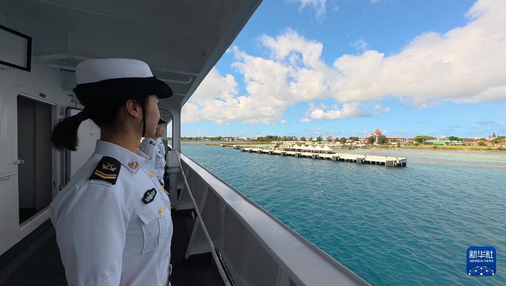 10月13日,执行“和谐使命-2025”任务的中国海军“丝路方舟”号医院船抵达汤加努库阿洛法港。这是医院船官兵向欢迎人群挥手。新华社发(崔晓洋 摄)