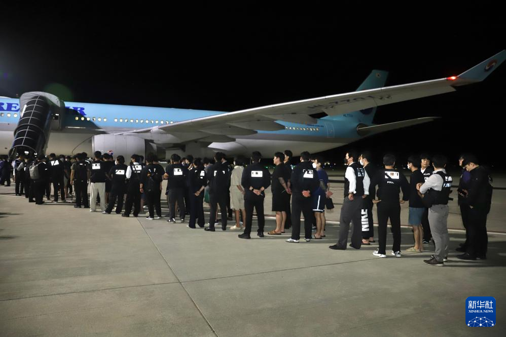 10月18日凌晨,在柬埔寨金边德崇国际机场,警察押送被遣返的韩国网络诈骗嫌疑人登机。