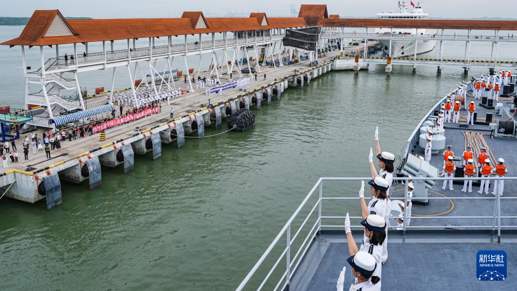 11月29日,在马来西亚巴生港,学员在甲板分区列队,向欢迎人群挥手致意。新华社发(王磊摄)