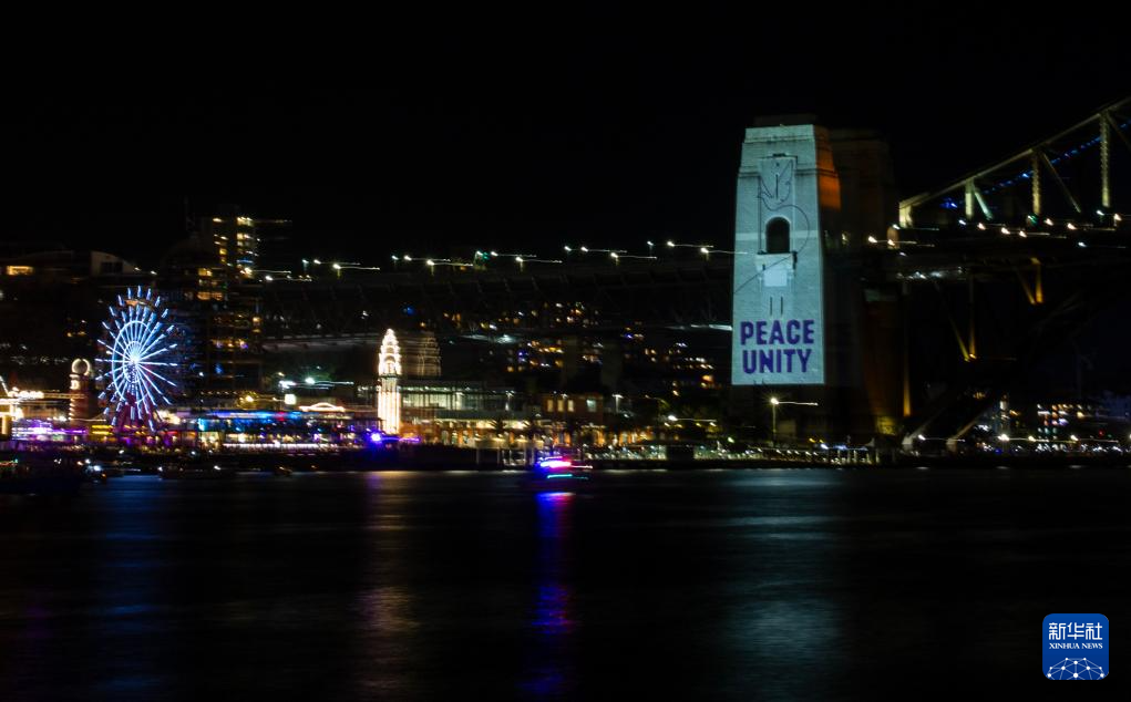 12月31日,澳大利亚悉尼海港大桥被白色灯光点亮,并投射出“和平”“团结”字样及和平鸽图案。
