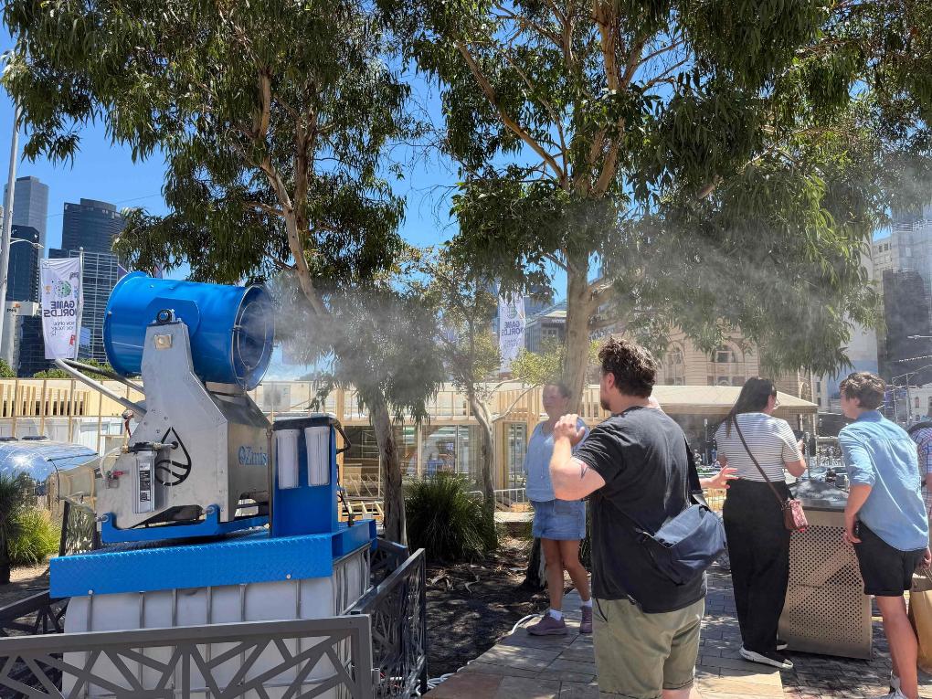 1月7日,在澳大利亚墨尔本联邦广场,游人在水雾降温点纳凉(手机照片)。新华社记者徐海静摄