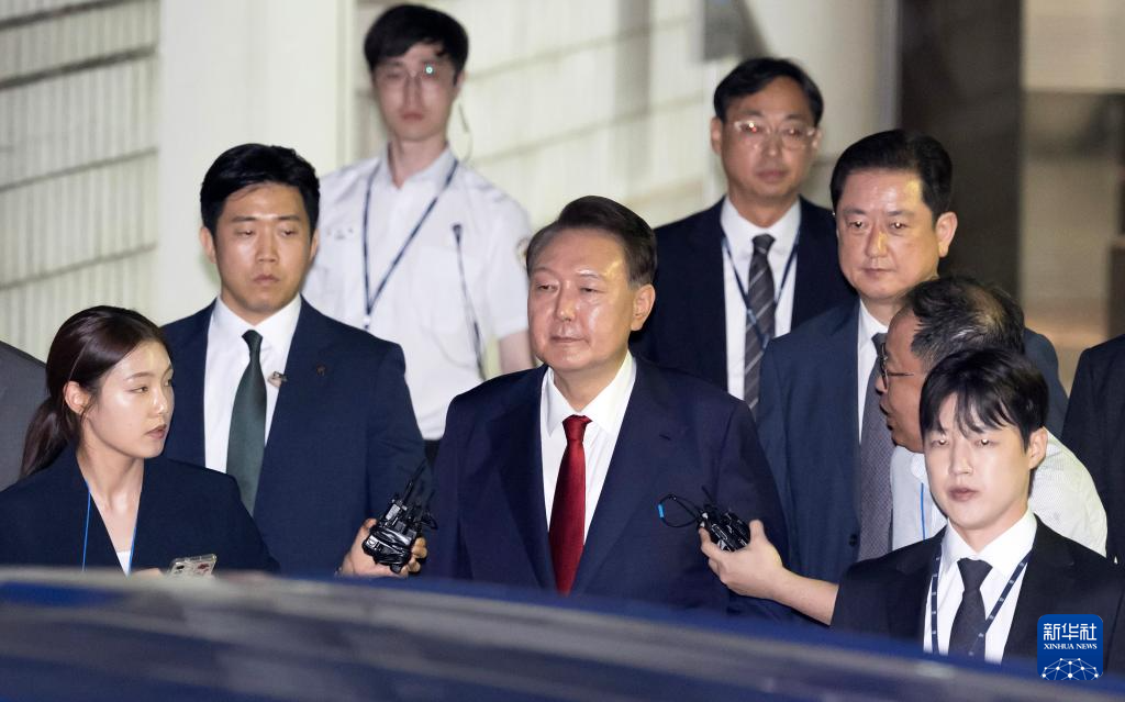 这是2025年7月9日晚,韩国前总统尹锡悦接受讯问后走出首尔中央地方法院(资料照片)。新华社/纽西斯通讯社