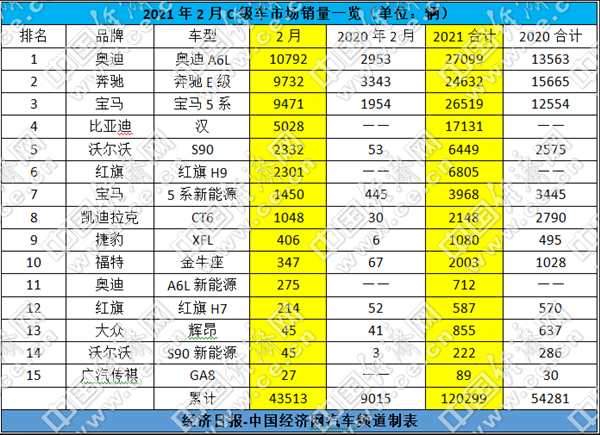 经济日报-中国经济网记者梳理后发现,共有来自11个品牌的15款车型公布了销量数据:2月,国产C级车的累计销量为43513辆,与去年同期相比增长382.67%;今年前2个月的累计销量为120299辆,同比增长121.62%。