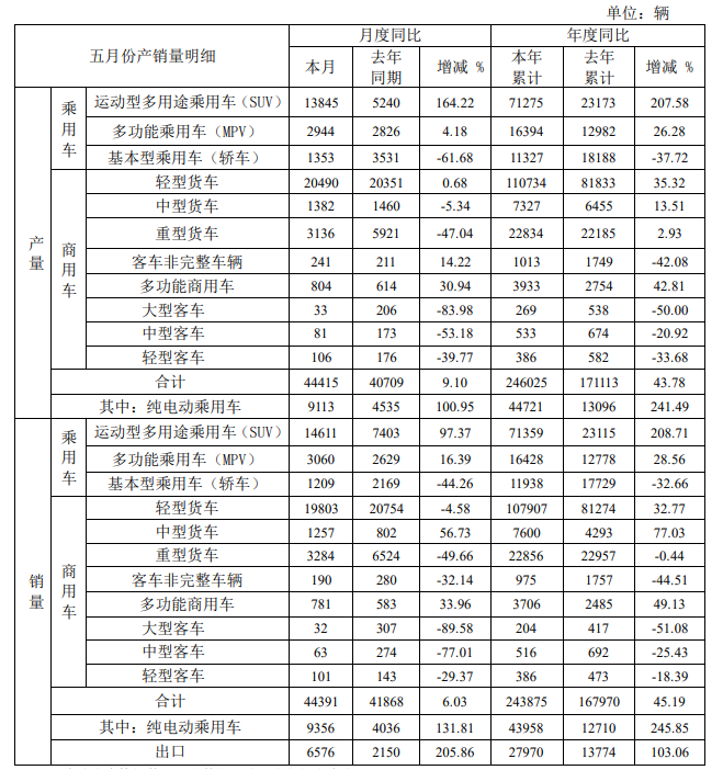 根据5月产、销快报,江淮汽车当月实现产量44415辆,同比增长9.10%;实现销量44391辆,同比增长6.03%。其中乘用车共销售18800辆,纯电动乘用车销量9356辆,同比增长131.81%。2021年1-5月,累计实现产量246025辆,同比增长43.78%;累计实现销量243875辆,同比增长45.19%。