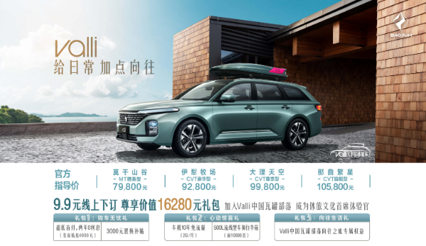自上市之日起,广大用户通过新宝骏APP/新宝骏汽车小程序/菱菱邦APP/京东、天猫官方旗舰店等平台,仅需9.9元线上下订,可享受价值16280元礼包,包括三重大礼。礼包1:购车无忧礼——超低首付,两年0利息(至高贴息4000元),3000元置换补贴;礼包2:心动惊喜礼——车机10年免流量(2G/月),500L流线型车顶行李箱(前10000名);礼包3:向往生活礼——Valli中国瓦罐部落向往之旅专属权益。用户加入Valli中国瓦罐部落,即可成为休旅文化首席体验官。(注:礼包1、2不含手动挡)