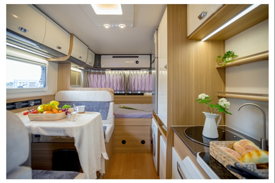 大驰智能房车在设计上对房车水电系统功能进行了优化,即使是外观也做了生活化审美的设计优化,让房车成为一个“可移动的家”。基于智能的理念,大驰智能房车根据房车使用过程中的人机场景,在有效空间内设置魔术空间和场景化空间功能等。在房车内部,设计有餐桌椅,有床褥,有柜子和操作台等,旅途中可以坐着一边享受自制美味茶点,一边观看风景。