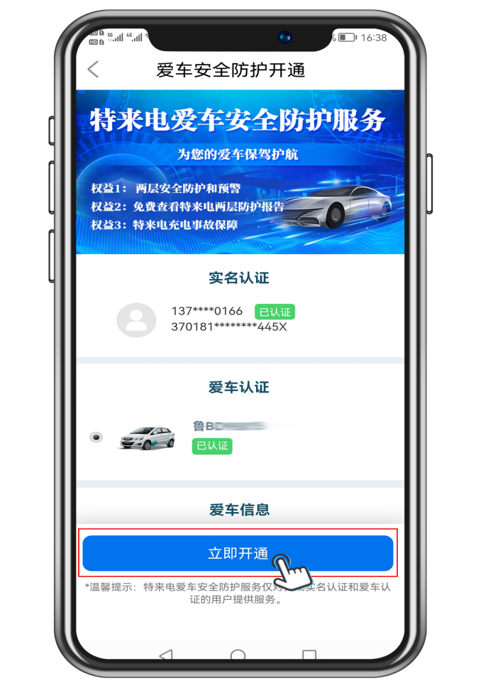3.下翻到底,点击“开通服务”,进行爱车和实名认证,填写相关信息后点击“立即开通”。