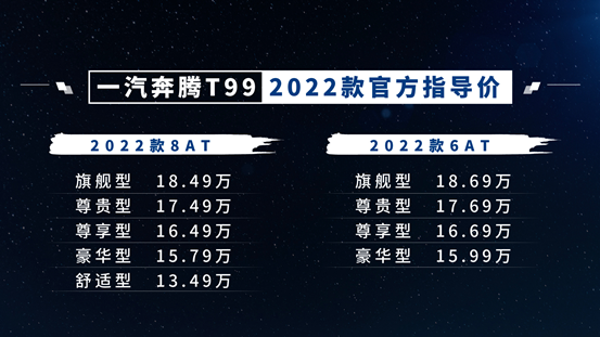 8月17日,2022款奔腾T99上市发布会举行,提供9款车型,售价区间为13.49万-18.69万元。同时还为用户提供四重豪礼,以及全品牌“518”服务权益。