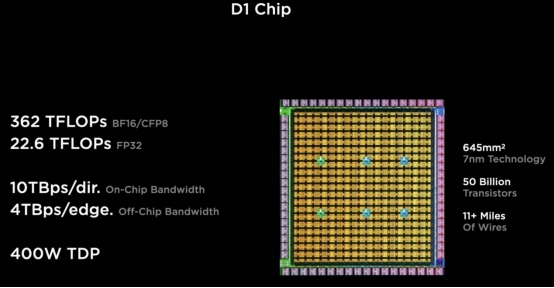 另,特斯拉自研的Dojo芯片D1,是专门为训练神经网络而优化的芯片,采用了7nm工艺,在645平方毫米面积上拥有500亿个晶体管。单个芯片的算力达到362TFLOPS(BF16/CFP8),片上带宽为10TBps,片外带宽为4TBps,该芯片拥有GPU级别的计算能力和CPU级别的灵活性,以及两倍的神经网络芯片级别的IO带宽。