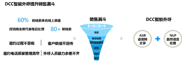 针对上述痛点,我们设计和推出了DCC智能外呼解决方案:利用ASR语音转文字、NLP自然语言处理等AI技术,赋能邀约到店漏斗,取得了非常积极的效果和反馈。