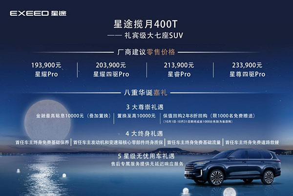 9月30日,以“探享·人生新境界”为主题,星途汽车全新旗舰车型——“礼宾级大七座SUV”星途揽月400T正式上市。新车共推出星耀Pro、星耀四驱Pro、星睿Pro、星尊四驱Pro四款配置版型,官方指导价为19.39万元 – 23.39万元。