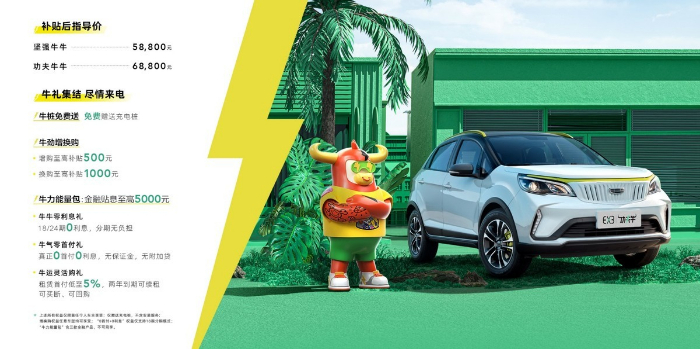 几何汽车还为用户准备了牛桩免费送、牛劲增换购、牛力能量包三大“牛气”豪礼:每位购买EX3功夫牛的用户不仅将免费获得充电桩,增购用户还可享受至高补贴500元,或者换购用户可享受至高补贴1000元。同时,用户可享受至高5000元金融贴息,其中包括牛气零首付礼(0首付0利息提车)、牛牛零利息礼(18/24期0利息购车)、牛运灵活购礼(租赁首付低至5%),三款金融贴息任选其一。