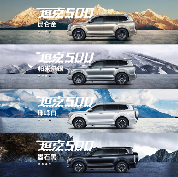 本次坦克500推出昆仑金、帕米尔银、珠峰白、墨石黑四款外观颜色,以及双棕、蓝米、黑色三种内饰配色;定位中大型豪华越野SUV,坦克500以兼容品质越野和商务豪华的强大产品实力,引人注目。