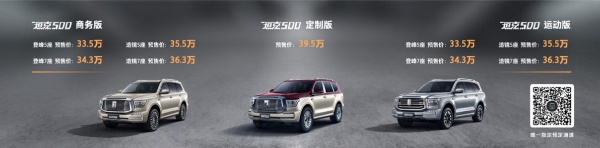 11月19日,坦克500在广州车展开启预售,共推出商务版、运动版及定制版三个版本,同时提供5座、7座车型可选,预售价格为33.5万元-39.5万元。同时,与用户共创的坦克500黑武士版本同步开启预售,预售期限量发售500台,预售价格为36.5万元。针对预售订购用户,坦克品牌还推出了惊喜4重礼以及6项限量福利政策。