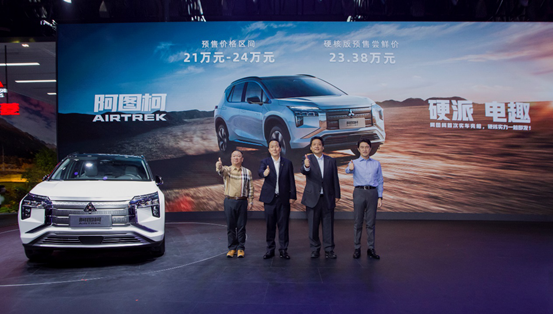 11月19日,广汽三菱全新纯电SUV阿图柯(AIRTREK)首次实车亮相,并同步开启预售。预售价格区间为21万元-24万元,其中硬核版预售为23.38万元。阿图柯作为广汽集团和三菱汽车首款新能源合作车型,它标志着广汽三菱电动化时代的正式来临,也为广汽三菱的产品矩阵强势赋能。