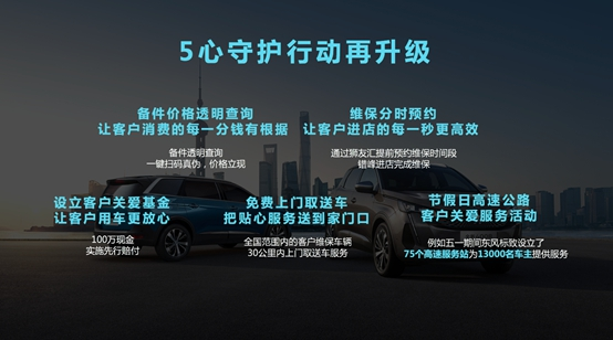 在整个2021年,东风标致根据客户及终端网络的反馈,对“5心4保”进行持续升级和快速迭代,推出了包括备件价格透明查询、设立客户关爱基金、维保分时预约、节假日高速公路不限品牌免费关爱服务等一系列升级服务。