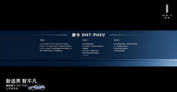 上市同时,摩卡DHT-PHEV还为用户准备了购车多重礼遇。权益一,在3月1日24点前购车享2000元抵10000元购车款,从3月2日到31日24点前下订享2000元抵8000元购车款。3月31日24点前,下订0焦虑性能版享5折升级为激光大灯,尊享36期0息及至高7000元置换补贴。权益二,终身免费基础保养,享三电系统、发动机及变速器终身免费保修,享5年或15万公里整车质保,赠送充电桩及基础安装服务(限首任车主);权益三,终身免费体验NOH智慧领航辅助驾驶系统,终身免费基础流量、基础服务及尊享服务,娱乐服务3年免费,终身免费车辆专属体检,终身免费道路救援。