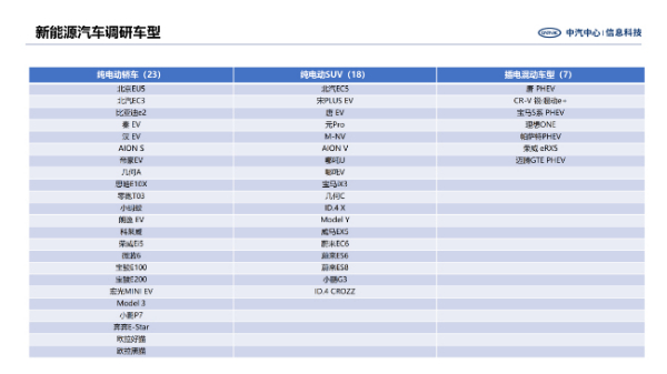 本期新能源汽车客户满意度调研涉及纯电动、插电混动热销车型共48款,包含合资、传统自主及新势力品牌。按照能源类型和车身结构,将调研车型划分为纯电动轿车、纯电动SUV、插电混动车型(轿车+SUV)三个细分市场进行分类统计。