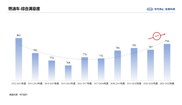 从燃油车市场整体满意度来看,自主品牌车型平均满意度为788分,相比上年度776分,增长12分,而合资品牌车型平均满意度为799分,相比上年度796分,增长3分,自主品牌竞争力提升幅度大于合资品牌,可见自主品牌的不断发力有所成效。