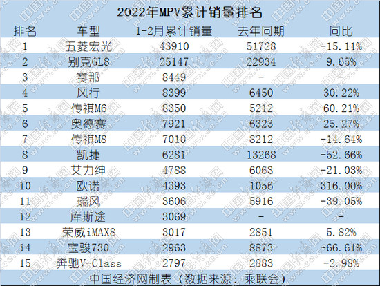 整体来看,MPV市场头部聚焦效应愈加明显。今年前两月,五菱宏光以43910辆的成绩一马当先,上汽通用别克GL8排名第二,累计销售25147辆,前两名都在两万辆以上规模,但从第三名赛那到第八名凯捷,其规模只有六千至八千辆的水平,两阵营之间存在明显断层。