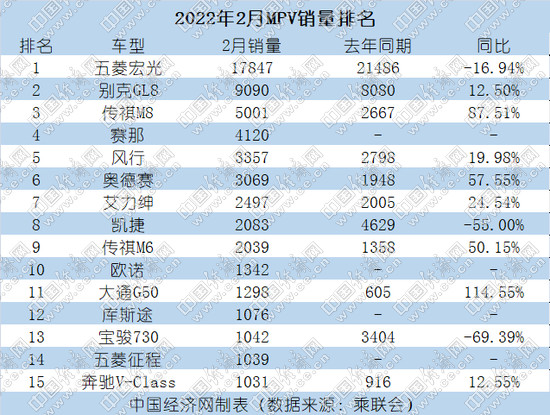 根据乘联会日前公布的数据,2月全国MPV车型共销售6.6万辆,同比增长1.7%,环比下降34.4%;1-2月,全国MPV累计销售16.8万辆,同比下降6.0%。聚焦产品层面,2月,广汽传祺M8重新归位,销量排名第三;广汽丰田赛那进一步站稳头部阵营,跻身前四。2月涨幅最大的车型为上汽大通G50,涨幅超一倍;跌幅最大的车型五菱凯捷销量遭腰斩。