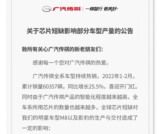 针对芯片短缺影响部分车型产量的情况,3月11日,广汽传祺发布公告称,因全球芯片短缺,传祺M8和影豹的生产及交付受到影响,广汽传祺正积极解决,目前传祺M8芯片供应有所好转,未来将优先排产福祉版车型,从而满足特殊用户的需求。